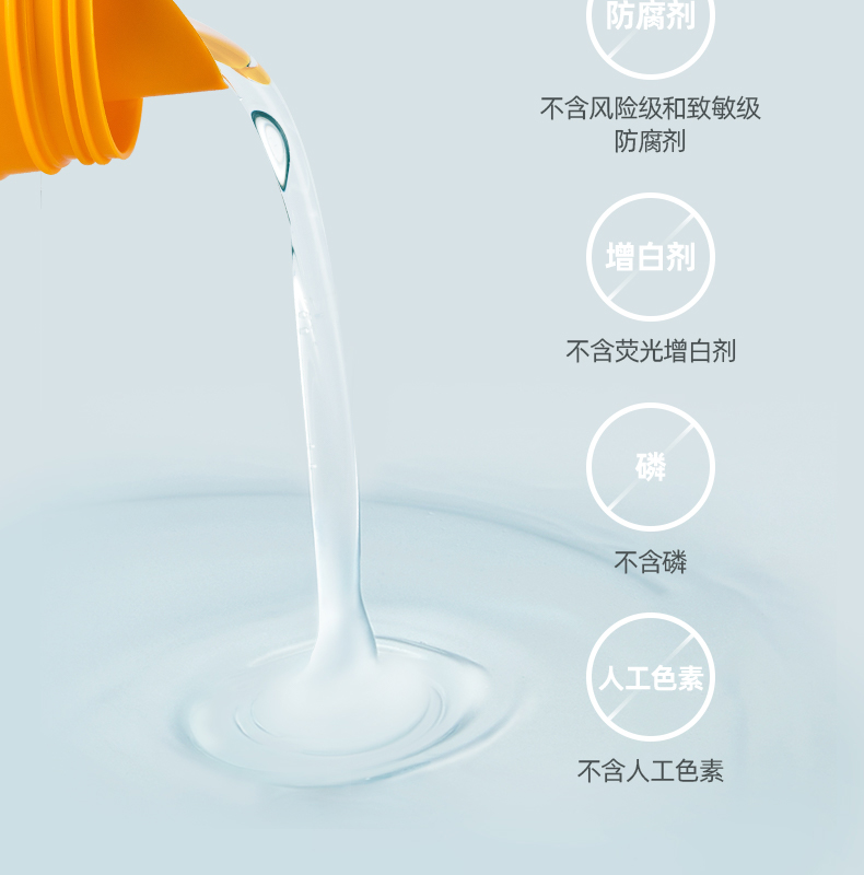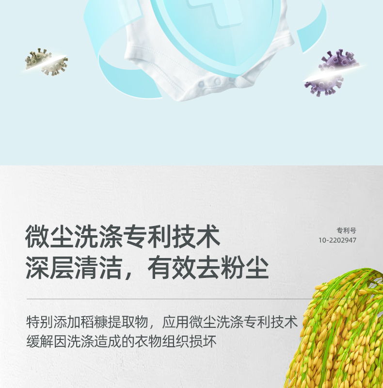 专门为婴幼儿研发的洗衣液,浓缩型配方,活性物高达28%以上,强力祛除油渍、奶渍、汗渍、果蔬汁液等多种污渍;NAC-5抗菌专利配方,抑菌率>99%,含稻糠提取物,应用微尘洗涤专利技术防御粉尘,为宝宝建立一道安全屏障,采用EWG绿色等级可降解配方,轻松洗涤;不添加11种有害物质,安心使用妈妈无忧。
