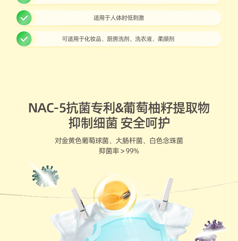 全新升级,NAC-5天然提取物复合抗菌专利配方,抑菌率>99%,远离细菌尽情玩耍;含稻糠提取物,应用微尘洗涤专利技术防御粉尘呵护宝宝稚嫩肌肤,EWG绿色等级高级植物棕榈油皂基及活性剂,强力去污;含山茶籽油、橄榄果油、牛油果树果脂等多重保湿成分,呵护妈妈双手;不添加13种有害物质,易漂节能,安全洗涤,环境友好无负担。