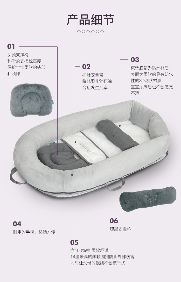 HARMAS PORTABLE BED 仿生舒睡婴儿床配有护肚安全带,不仅可以阻挡父母睡后无意识的挤压,有效防止因睡眠呼吸窒息而导致的猝死,又能实现科学共眠,增强宝宝的安全感。